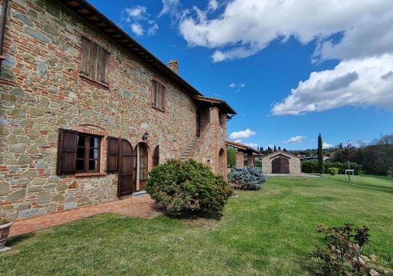 Das Gebäude aus Stein und Ziegeln erstreckt sich über eine Fläche von 300 qm, wunderschön restauriert im typisch toskanischen Stil, mit Kastanienholzbalken und Terrakotta-Ziegeln. Das Erdgeschoss zeichnet sich durch große offene Räume aus, in denen sich die Küche, das Wohnzimmer, das Arbeitszimmer, die Waschküche, die Speisekammer und das Bad befinden. Ebenfalls im Erdgeschoss befinden sich zwei schöne Laubengänge. Der erste Stock besteht aus einem Flur und drei Schlafzimmern mit jeweils drei Bädern. Zugang zum ersten Stock Der erste Stock ist über eine Innentreppe oder eine alte Außentreppe aus Pietra Serena erreichbar.