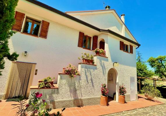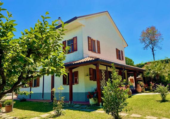 Detached house with beautiful sea view in the middle of the countryside, surrounded by olive trees, palms and fig trees. The house offers everything one needs, internally and externally, perfect for those who want to admire the beautiful hills and have the proximity of the coast, which is only a few minutes away. The garden has an area of 5,000 m2 and is completely fenced. The outside of the house is plastered white, you enter the garden through an automatic gate and you immediately find a parking space with covered parking and a garage. The ground floor consists of a kitchen , an open plan dining room, a sitting room with a fireplace leading through French doors to the loggia which doubles as a living room, a very large laundry room, utility room plus a large bathroom with bath and shower. Upstairs there are 4 large bedrooms and 3 bathrooms. in the garden we find the swimming pool of 4.5 x 8 meters with salt water filtration and a view of the sea. There is a large grill and barbecue, as well as an outdoor shower with solar panels for hot water, and a changing room and a bathroom adjacent to the pool. There is also an annex of 50 m2, ideal for dinners and parties. The heating is centralized on gas and the water is heated by solar panels.