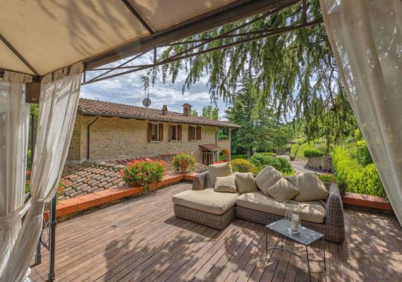 تم تجهيز المنزل الحجري بشرفات، حيث يمكنك من خلالها الوصول إلى مرافق الشواء وفرن الحطب. من هنا يمكن أيضًا الوصول إلى التراس الكبير المجهز بأرضيات خشبية وشرفة مراقبة وطاولة وأريكة كبيرة. في هذه المنطقة، والتي يمكنك من خلالها الوصول إلى غابة الصنوبر أعلاه، يوجد حوض مساج مائي يتسع لـ 8 أشخاص.