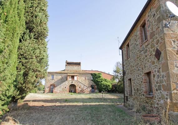 Das erste Anwesen, bestehend aus 3 Wirtschaftsgebäuden, befindet sich auf dem Gipfel eines zum Grundstück gehörenden Hügels, den man über eine schöne Zypressenallee erreicht. Es besteht aus einem zweistöckigen Hauptgebäude von ca. 120 m², wobei sich der Wohnteil im ersten Stock und der Keller im Erdgeschoss befinden.