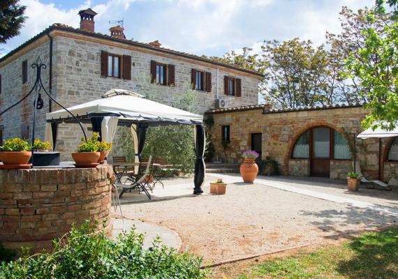 La propiedad tiene todas las características típicas del estilo rústico toscano, como suelos de terracota, vigas de madera expuestas, arcos de ladrillo y una fachada de piedra.