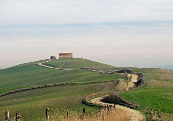 camino sin asfaltar, rodeada de campos cultivables; esta propiedad tiene las características típicas de la Toscana.