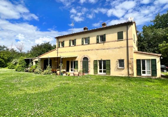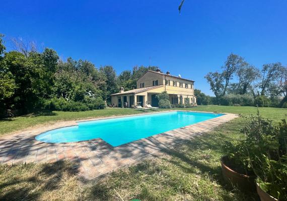 Elegant country house from the 19th century, located just 10 minutes away from the sea and the town of Fano. It enjoys total privacy. A beautiful lawn in front of the house provides relaxation, as do the covered terraces on two sides of the house, ideal for dining al fresco. The grounds consist of 15.735 sqm of land with 180 olive trees and about 10 fruit trees; cherries, figs and apricots etc. There is a swimming pool of 12x7m. The interior of the house is very elegant and consists of a dining room, two lounges with a fireplace, one of which has beautiful vaults and a beautiful bright room that can be used as a studio or as a third sitting room, a kitchen (with vaults as a ceiling), bathroom, a laundry room and a technical room with the heating boiler on the ground floor: On the first floor there are 4 bedrooms and two bathrooms.