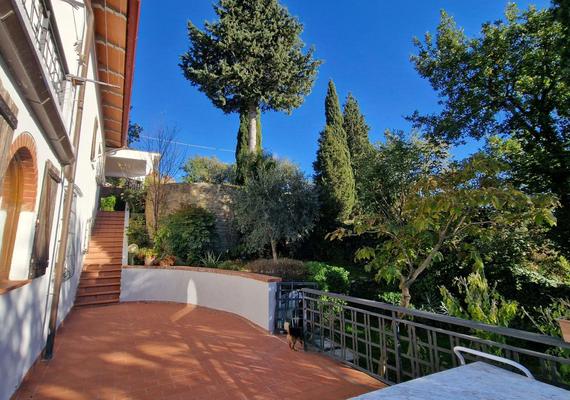 En el exterior, una gran logia abraza la parte delantera de la casa, proporcionando espacios sombreados ideales para relajarse, mientras que en la parte trasera, las terrazas panorámicas ofrecen una vista extraordinaria que abarca desde la Valdichiana hasta el lago Trasimeno. La propiedad también incluye una terraza de piedra que añade un toque rústico y refinado.