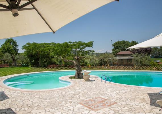 The villa is surrounded by a marvellous fenced park, perfectly maintained and adorned with flowering shrubs, which houses a splendid bean-shaped swimming pool with solarium, sunbeds, sun umbrellas and changing rooms. Within the park there are also ten potted olive trees, fruit trees, a tool shed and a covered parking garage.