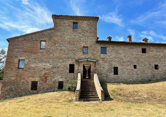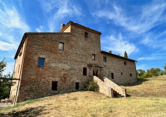 Urbino, a few km from the city center, this large country house is located in the middle of nature, among the beautiful hills of Montefeltro in a landscape that is still intact. The estate is 10 km from the center of Urbino (the last 600 meters are on a dirt road), but is connected to the town by public transport. The other distances are km. 28 from the A14 motorway (Pesaro) and Ancona airport about 70 km. The country house of about 600 square meters is built of hand-made bricks and natural stone and is spread over three floors plus a tower. Born as a manor house with adjoining farm, it was then used as two lodgings for peasant families and after its purchase converted into a single dwelling by the current owner, through a conservative restoration, preserving all the characteristic architectural elements such as a loggia with oven , an external courtyard with a well and a raised terrace . On the west side of the building there is a terrace with a pergola, while inside the building is composed as follows: on the two lower floors, a living room, dining room, kitchen, three reception rooms, a guest bedroom with bathroom, a servant's quarters with two bedrooms, walk-in closet, bathroom and kitchen, a room for the boiler and two storage rooms; on the upper floors, four bedrooms, two bathrooms, two rooms, a kitchenette with an adjoining room for breakfast and the aforementioned loggia. Valuable elements in the building are the tower, five fireplaces (three in the reception rooms, one in a bedroom and one in the kitchen). Most of the ceilings are with exposed beams, the floors are partly in antique terracotta and partly in precious materials. there is an outbuilding of 72 m2 , a garage 36 m2 and a surrounding garden of approx . 3,000 m2